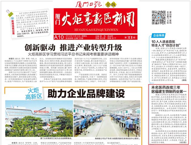 《廈門日報》:未名醫藥連續三年居福建生物制藥業第一