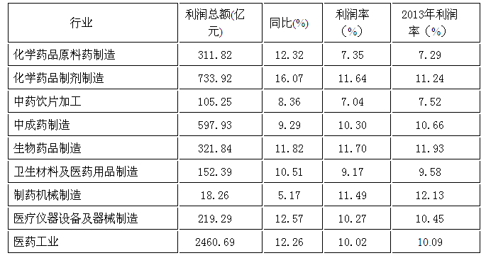 根據統計快報,2014年醫藥工業規模以上企業實現利潤總額2460.69億元,同比增長12.26%,高于全國工業整體增速8.96個百分點,但較上年降低5.34個百分點,與主營業務收入同步出現了較大幅度的下降。主營收入利潤率爲10.02%,較上年下降0.07個百分點,基本穩定。納入統計範圍的企業中,約10%的企業出現虧損。各子行業中,化學原料藥、化藥制劑主營收入利潤率較上年略有增長,其餘子行業利潤率均較上年有所下降。